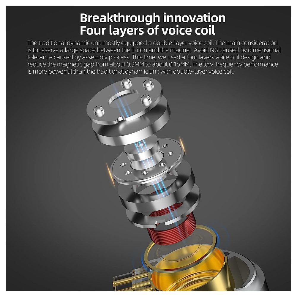 - 4.8 Micron thick diaphragm, four layers of voice coil - KZ ZVX in-ear headphones earphone using a diaphragm with a thickness of about 4.8 microns, which significantly reduces the weight and improves the vibration sensitivity without losing any details. The four layers of voice coil is used, reducing the magnetic gap from about 0.3mm to about 0.15mm. The performance has been greatly improved, especially bass response. compared with double-layer voice coil dynamic driver, the bass diving depth, strength and elasticity is significantly better.